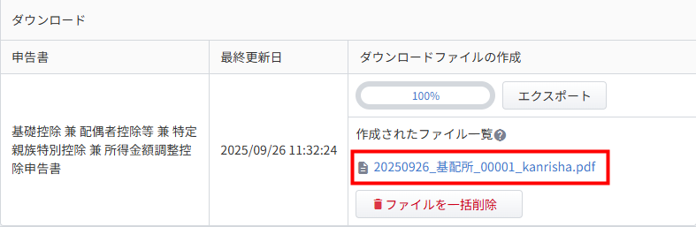 - 作成されたリンクをクリックし、PDF形式で出力された申告書をダウンロードします。
