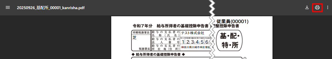 「基・配・特・所申告書」画面では、選択した従業員の「基礎控除 兼 配偶者控除等 兼 特定親族特別控除 兼 所得金額調整控除申告書」をPDF形式で出力できます。