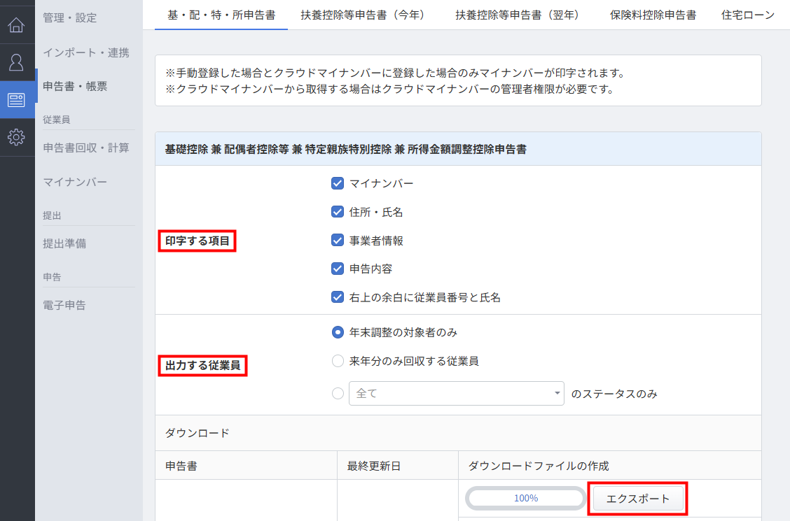 | ③ | ダウンロード | 「エクスポート」をクリックすると、申告書を出力できます。 |