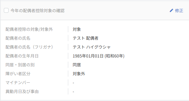 「来年の配偶者控除対象」には、配偶者が来年の控除対象となる場合に配偶者の情報が表示されます。