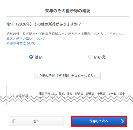 「来年のその他所得の確認」画面では、来年に給与所得以外の所得がある場合にその内容を入力します。