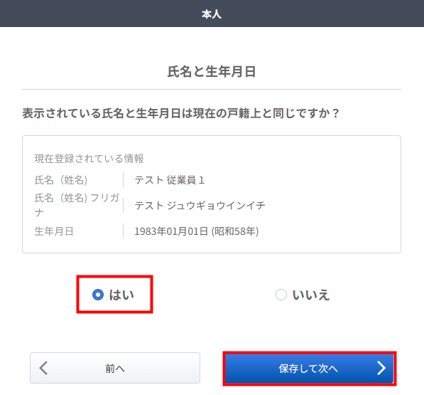 「氏名と生年月日」画面では、従業員情報に登録されている氏名と生年月日を確認します。