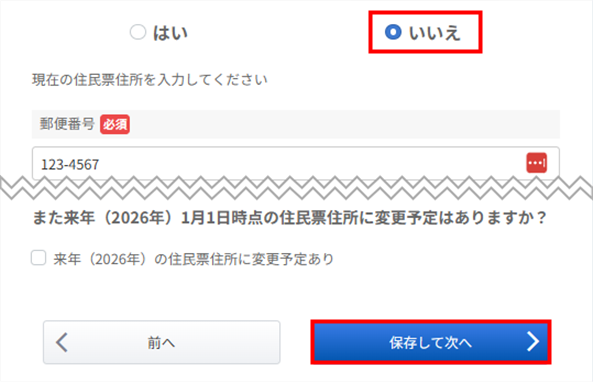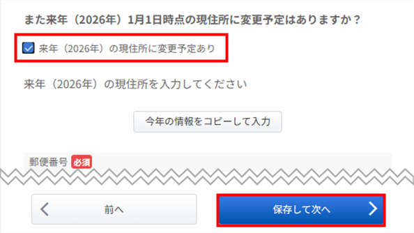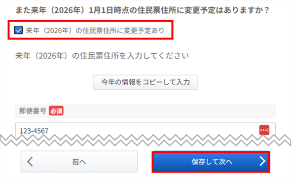 来年(2026年)の住民票住所を登録し、「保存して次へ」をクリックしてください。