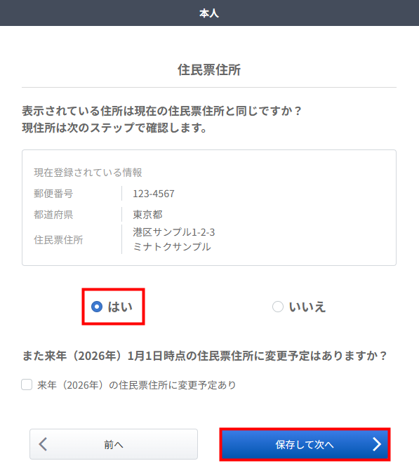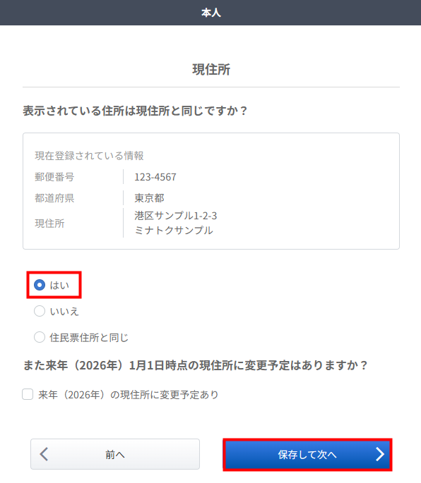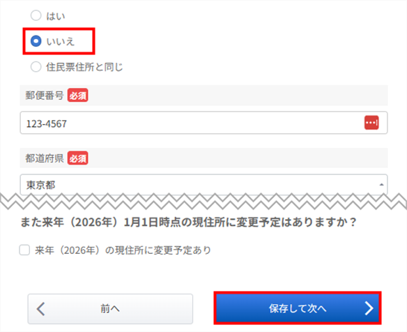 来年(2026年)の現住所を登録し、「保存して次へ」をクリックしてください。