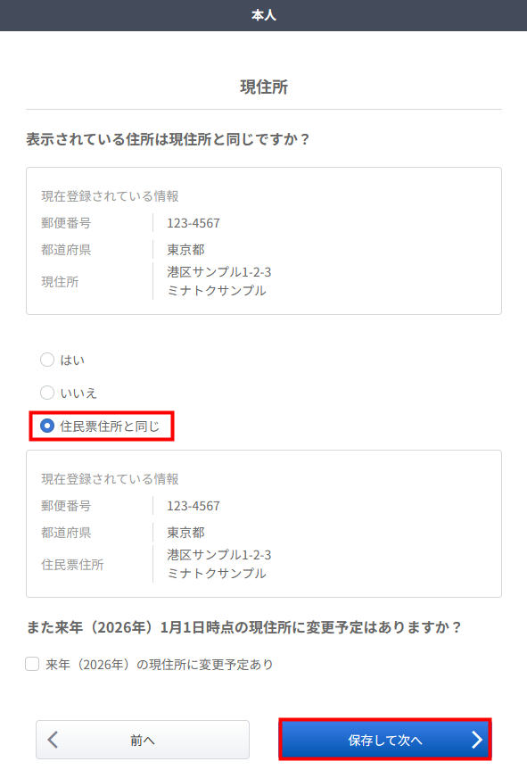 現在の住所と住民票の住所が同じ場合は、「住民票住所と同じ」を選択して「保存して次へ」をクリックします。