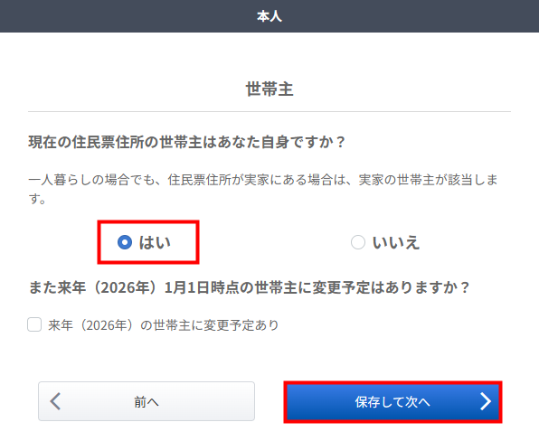 自身が世帯主の場合は、「はい」を選択して「保存して次へ」をクリックします。