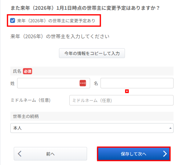 来年(2026年)の世帯主を登録し、「保存して次へ」をクリックしてください。