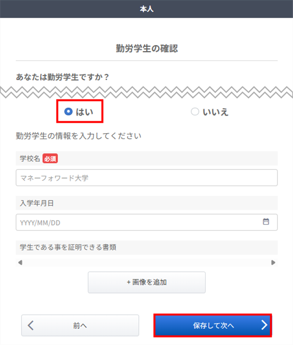 自身が勤労学生に該当する場合は、「はい」を選択して勤労学生の情報を入力します。