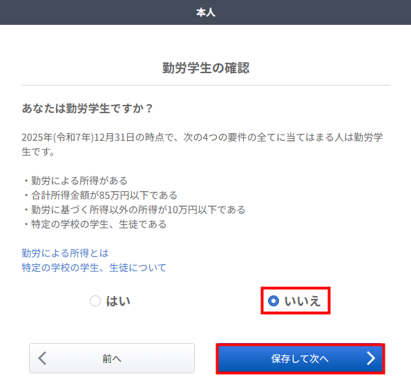 自身が勤労学生に該当しない場合は、「いいえ」を選択して「保存して次へ」をクリックしてください。