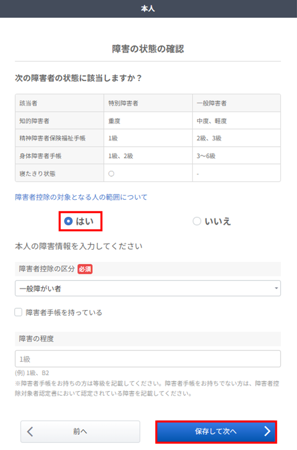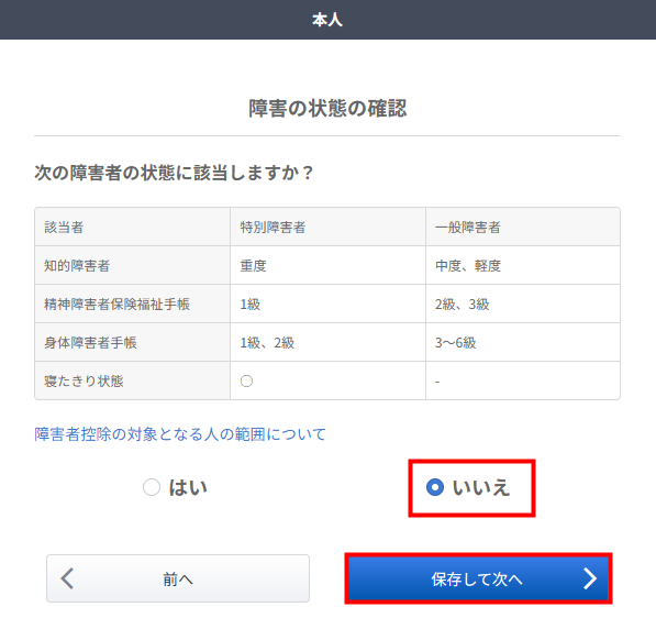 「障害の状態の確認」画面では、障害者控除の対象に該当するかを選択します。