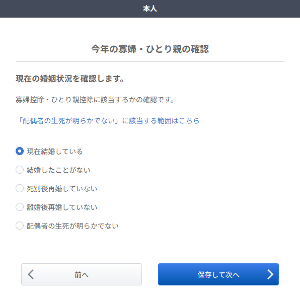 「現在結婚している」を選択すると、寡婦・ひとり親控除の対象外となります。