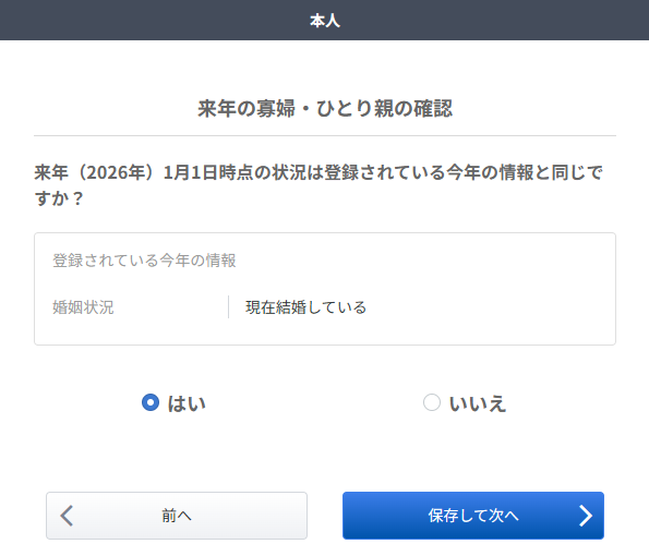 「来年の寡婦・ひとり親の確認」画面では、来年(2026年)における寡婦控除・ひとり親控除に該当するかを選択します。