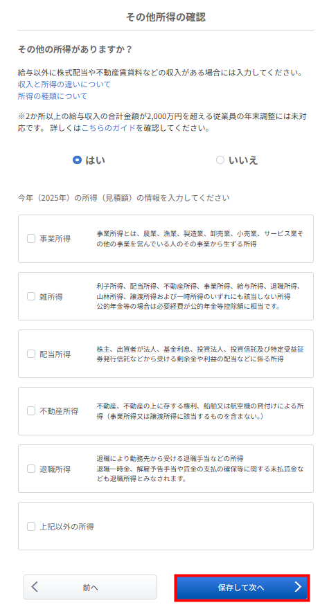 所得の情報を登録したら、「保存して次へ」をクリックしてください。