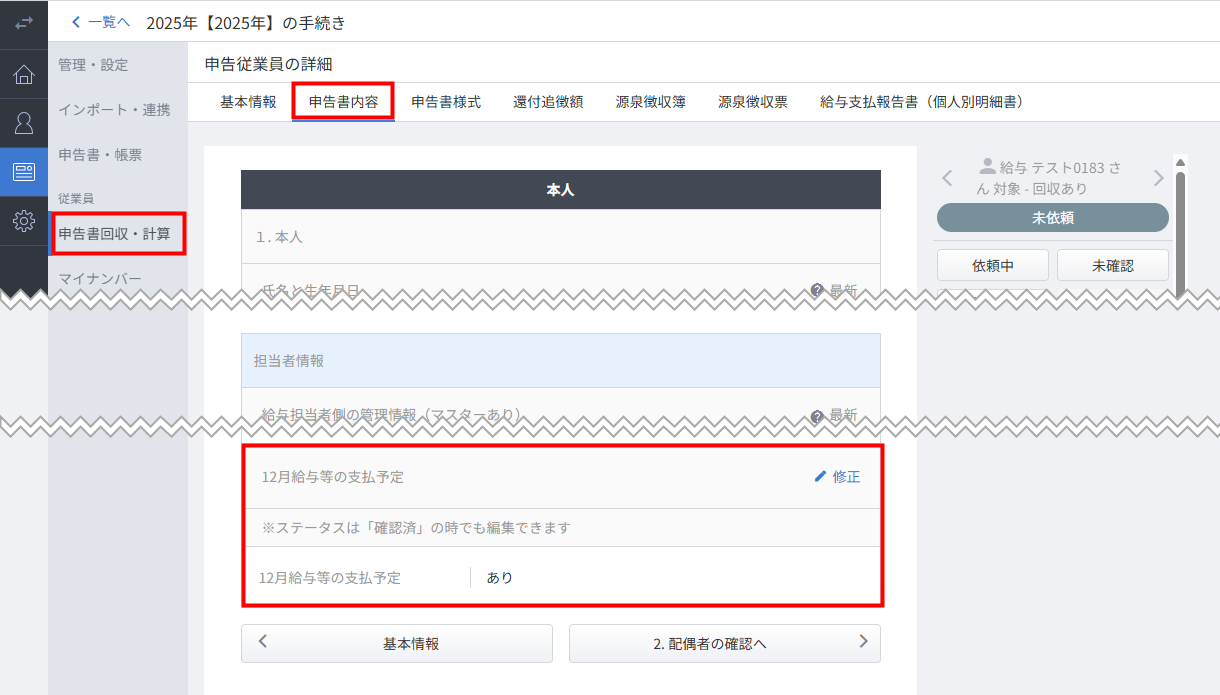「申告書回収・計算」>「申告書内容」>「担当者情報」に「12月給与等の支払予定」を追加しました。