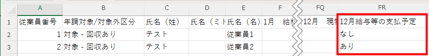 - 「12月給与等の支払予定」に「あり」または「なし」以外の値を入力してインポートした場合、エラーとなります。