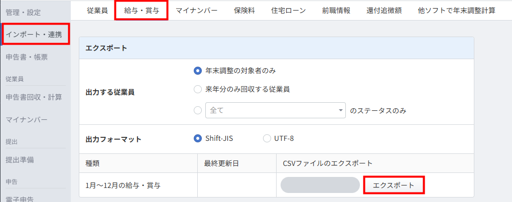 「手続き一覧」>「インポート・連携」>「給与・賞与」画面でエクスポートできるCSVに「12月給与等の支払予定」の項目を追加しました。