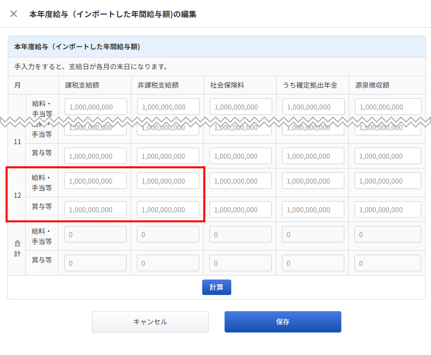 - 各月の支給額などの「12月給与等の支払予定」以外の項目を空欄でインポートすると、0円で上書きされます。すでに給与・賞与額が登録されている従業員の一括更新を行う場合、金額を削除しないようご注意ください。