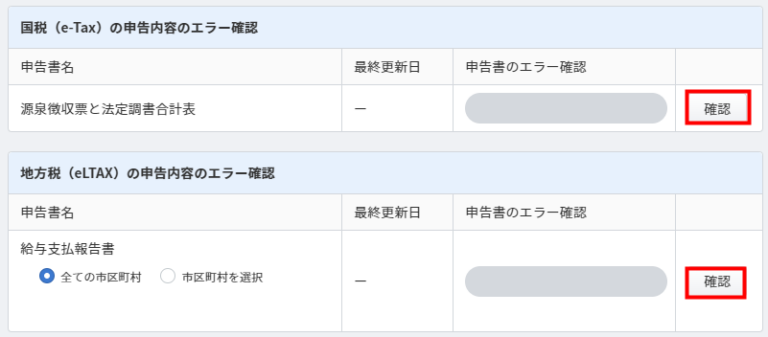 申告事業所設定が完了後、「国税(e-Tax)の申告内容のエラー確認」と「地方税(eLTAX)の申告内容のエラー確認」で「確認」をクリックし、申告データにエラーがないかを確認してください。