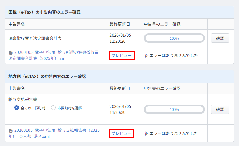 電子申告用のファイルが作成された後に「プレビュー」をクリックすると、電子申告の詳細を確認できます。