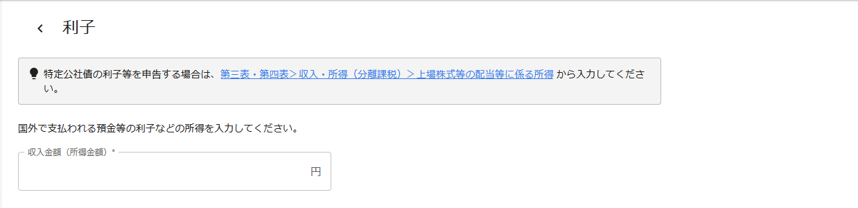 「利子」画面では、国外で支払われる預金等の利子や、特定の公社債による収入について入力します。