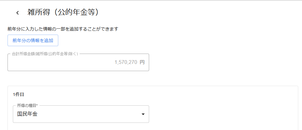 「雑所得(公的年金等)」画面では、国民年金や厚生年金、確定給付企業年金などの収入金額を入力します。