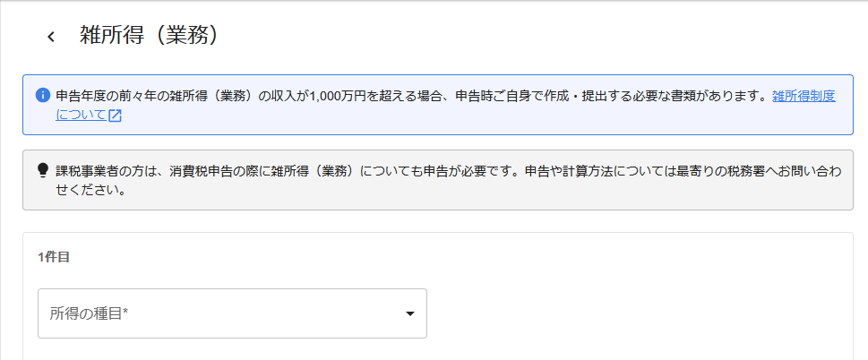 「雑所得(業務)」画面では、副業に係る収入のうち、営利を目的とした継続的な収入金額を入力します。