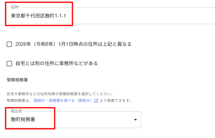 2026年2月1日に住所が変更になった場合、「住所」には申告書の提出日時点の住所を入力します。