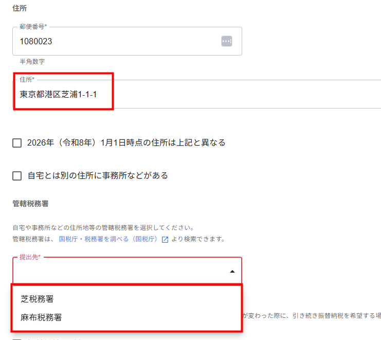 「住所」で登録されている住所を確認し、「提出先」で想定する税務署を選択してください。