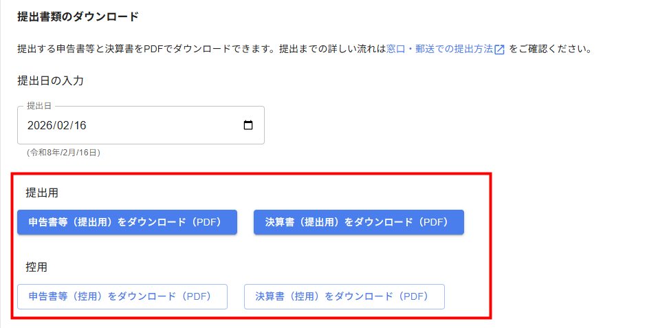 控用の書類をダウンロードしたい場合は、「申告書等(控用)をダウンロード(PDF)」「決算書(控用)をダウンロード(PDF)」をクリックし、作成した申告書等をダウンロードしてください。