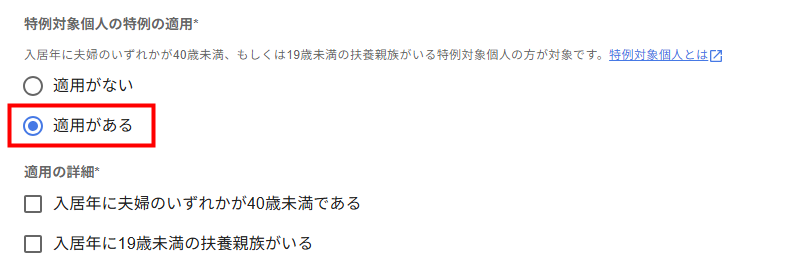 - 特例対象個人の特例に該当すると、「特例対象個人の特例の適用」の項目が表示されます。