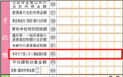 | × | 確定申告書第一表 「(62)本年分で差し引く繰越損失額」 | ![]() |