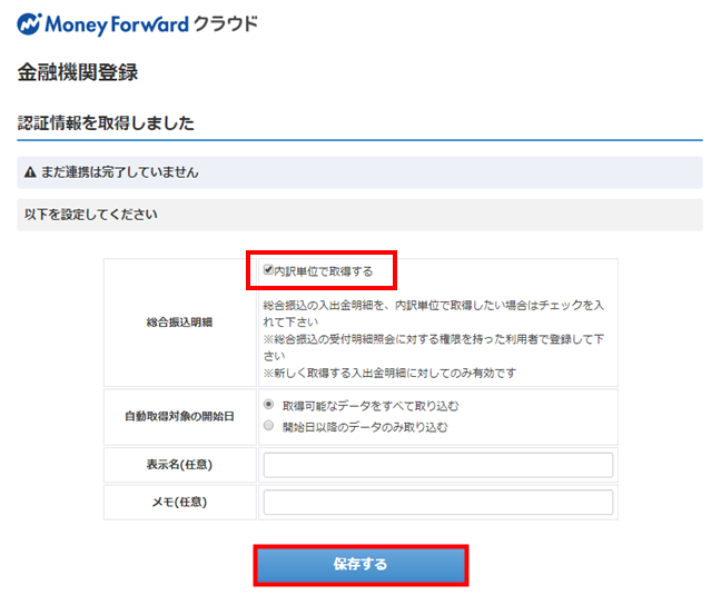 「データ連携」>「新規登録」画面で金融機関とのAPI連携を行う際に、「金融機関登録」画面にある「総合振込明細」の「内訳単位で取得する」にチェックを入れ、「保存する」をクリックしてください。