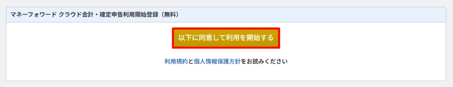 - 「マネーフォワード クラウド会計・確定申告利用開始登録(無料)」画面で「利用規約」と「個人情報保護方針」を確認し、問題がなければ「以下に同意して利用を開始する」をクリックします。