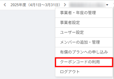 - 画面右上の事業者名をクリックし、「クーポンコードの利用」を選択します。