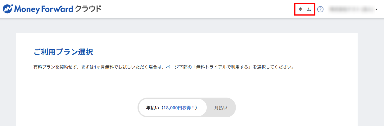 - 「ご利用プラン選択」画面右上の「ホーム」をクリックします。