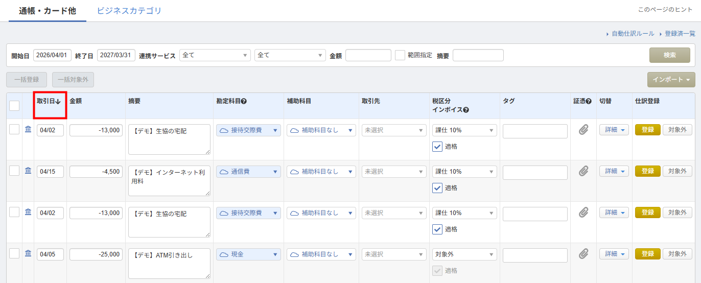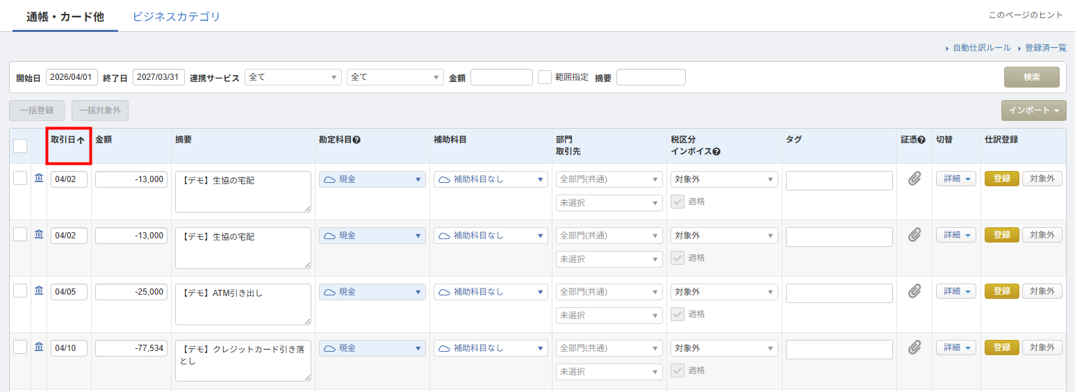 「連携サービスから入力(通帳・カード他)」画面において、「取引日」をクリックをした際の仕訳候補の並び順が変更になりました。