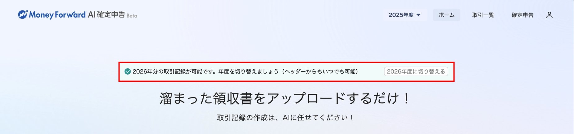 2025年度の「ホーム」画面上部に表示されるバナーから「2026年度に切り替える」ボタンをクリックすることで、会計年度を切り替えることも可能です。