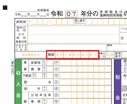 「その他事項」では、確定申告書の「種類」欄に反映する内容を設定します。