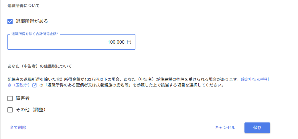 「退職所得について」では、家族や親族が退職所得を受け取っている場合に、「退職所得がある」にチェックを入れて「退職所得を除く合計所得金額」を入力します。
