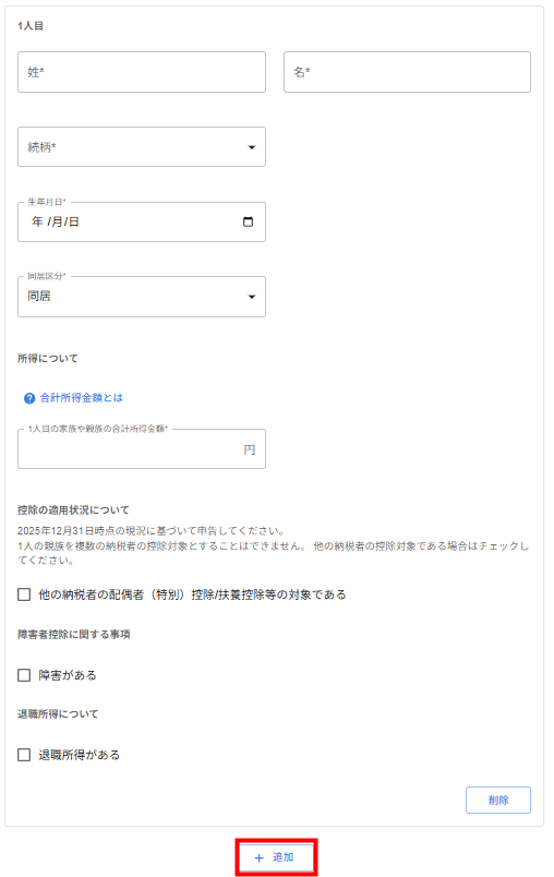 複数人扶養している場合は、「+追加」をクリックして追加してください。
