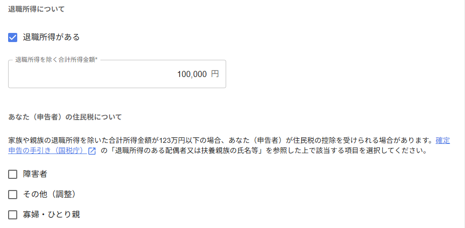 「退職所得について」の「退職所得を除く合計所得金額」で入力した金額が123万円以下の場合、「あなた(申告者)の住民税について」が表示されます。