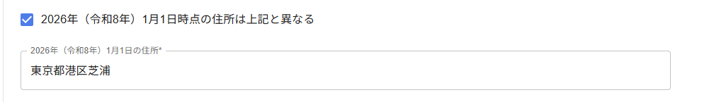 1月2日以降に引っ越しなどによって住所が変更になった場合は、「2026年(令和7年)1月1日時点の住所は上記と異なる」にチェックを入れ、1月1日時点まで居住していた住所を入力します。