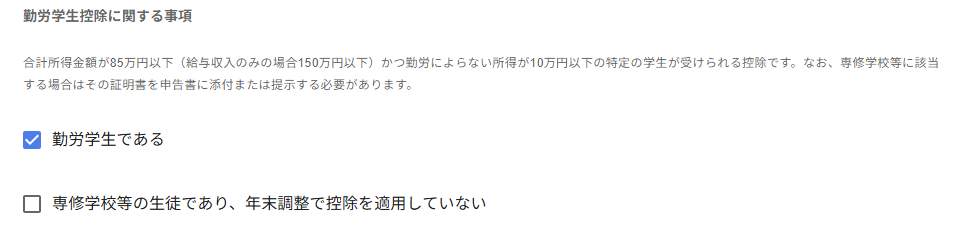 「勤労学生控除に関する事項」は、申告者が勤労学生控除の対象となる場合に入力します。