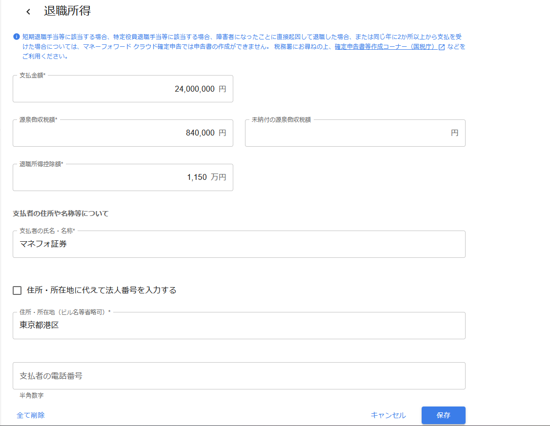 - 「退職所得」画面で各項目を入力して保存します。