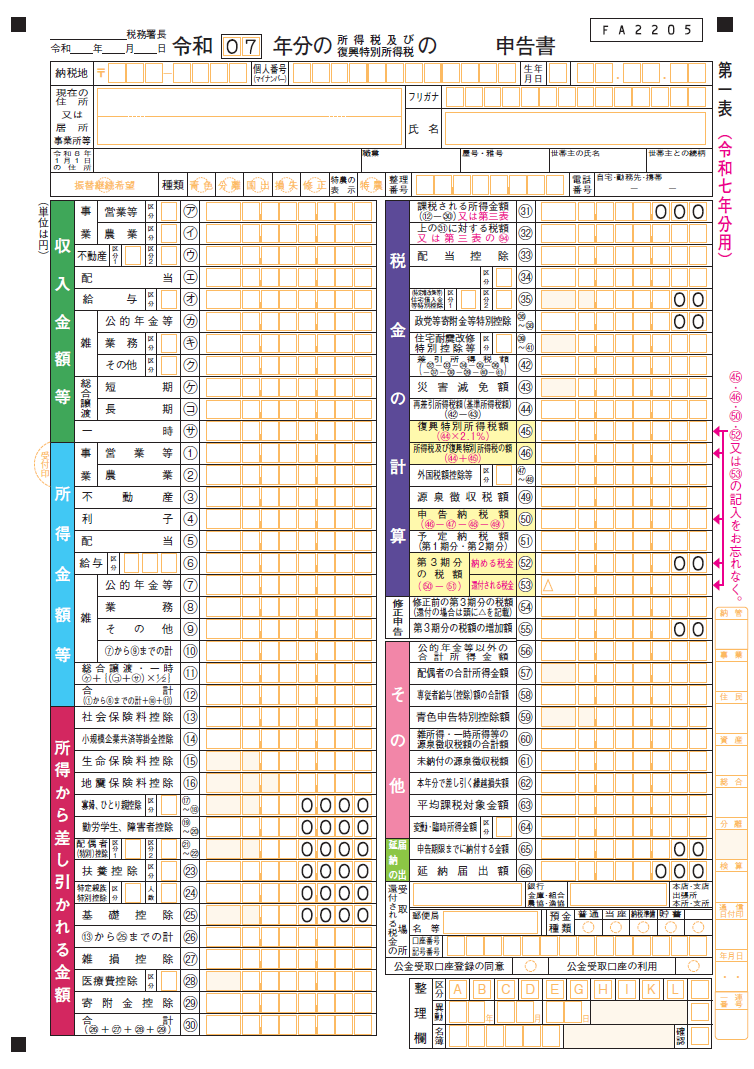 出典:国税庁,「申告書第一表・第二表【令和7年分用】」(2025年12月25日)