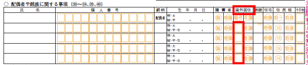 「基本情報」>「家族や親族」画面で同居区分「国外居住」を選択している場合、入力した内容に応じて国外居住の区分欄に以下の値が反映します。