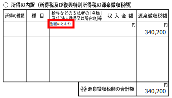 「所得の内訳書」が作成された場合、申告書第二表には「別紙の通り」と記載され、源泉徴収税額の合計金額のみ表示されます。