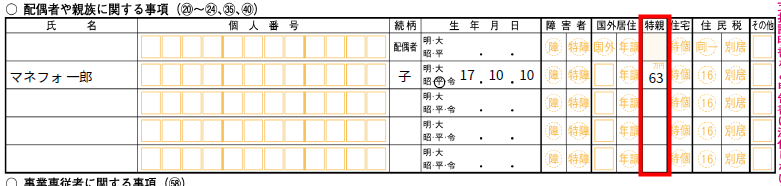 また、特定親族が「他の納税者の配偶者(特別)控除/扶養控除等の対象である」に該当しない場合、確定申告書第二表の「配偶者や親族に関する事項(20)~(24)、(35)、(40)」の「特親」欄に、特定親族のそれぞれの合計所得金額に応じた控除額を万円単位で記載が必要です。