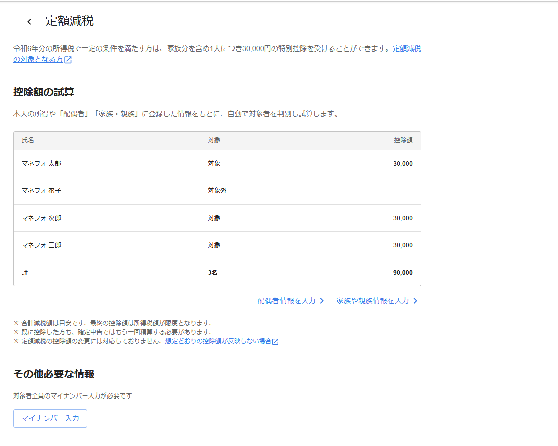 クラウド確定申告では、「基本情報」>「家族や親族」画面に入力した情報をもとに、対象者の判定や金額の算出が行われます。