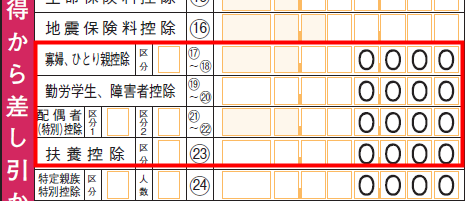 自動計算された金額は、該当箇所に応じて確定申告書第一表の「(17)~(18)寡婦、ひとり親控除」「(19)~(20)勤労学生、障害者控除」「(21)~(22)配偶者(特別)控除」「(23)扶養控除」のいずれかの欄に反映されます。